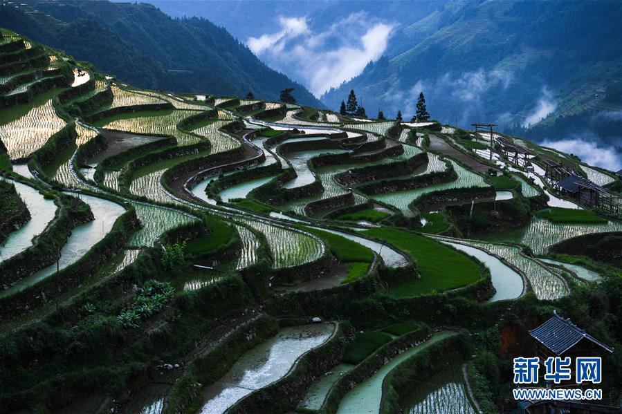 晨光中的從江縣加榜鄉(xiāng)加車梯田(5月28日攝)。夏日時(shí)節(jié),位于貴州省黔東南苗族侗族自治州從江縣加榜鄉(xiāng)加車、加頁(yè)、黨扭等苗寨的梯田在晨霧與陽(yáng)光的映襯下線條分明,光影變幻,景色如畫(huà)。新華社記者 楊文斌 攝
