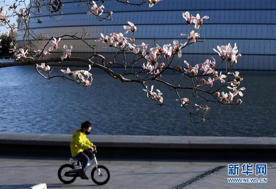 北京國家大劇院,小男孩在吐露芬芳的玉蘭花下騎車(3月14日攝)。新華社記者羅曉光攝
