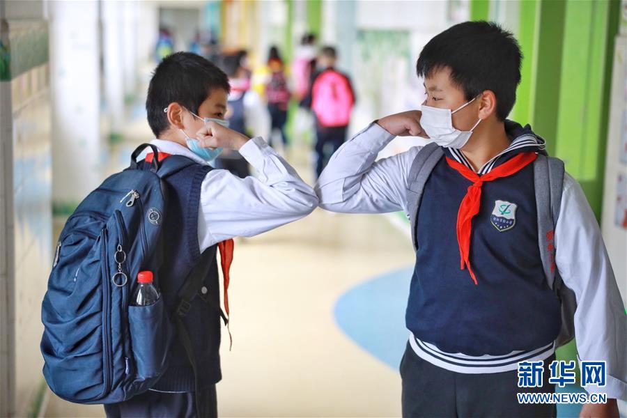 貴州貴陽,小學復課,兩名學生用“碰肘”的方式打招呼(5月25日攝)。新華社記者劉續(xù)攝