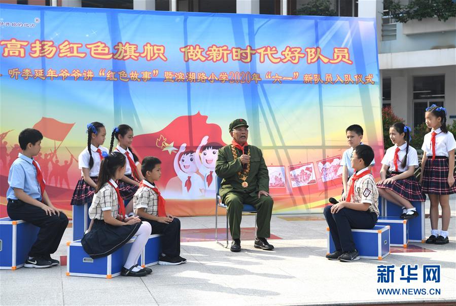 5月29日,李延年給孩子們講述紅色故事?!傲弧眹?guó)際兒童節(jié)來臨之際,“共和國(guó)勛章”獲得者、老一輩戰(zhàn)斗英雄李延年來到廣西南寧市濱湖路小學(xué)給孩子們講述戰(zhàn)爭(zhēng)年代的紅色故事,寄語(yǔ)他們好好學(xué)習(xí)、努力奮斗。孩子們向李延年贈(zèng)送了師生共繪的“紅色畫卷”,向老英雄致敬。新華社記者周華攝