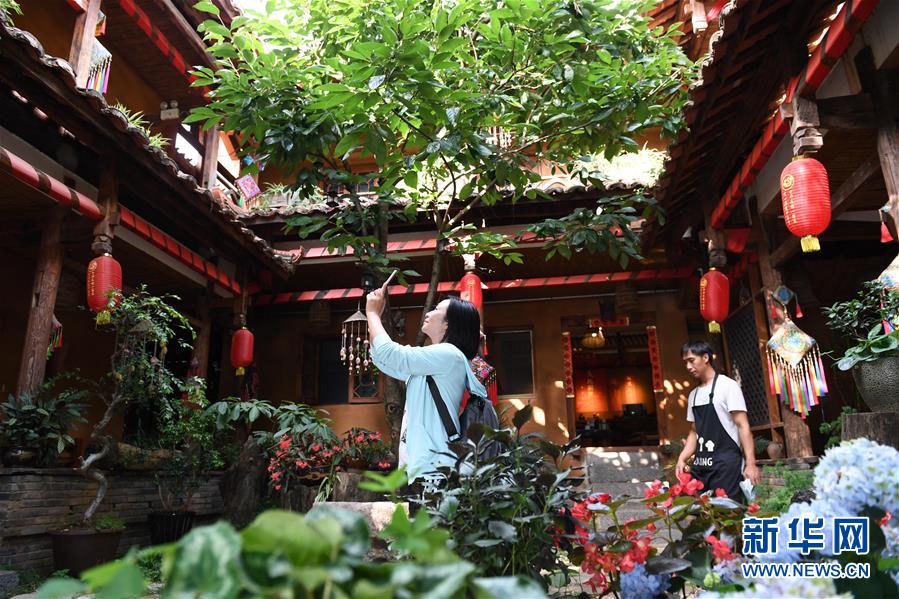 6月2日,游客在云南丘北縣普者黑仙人洞村一家客棧內(nèi)拍照。新華社記者楊宗友攝。