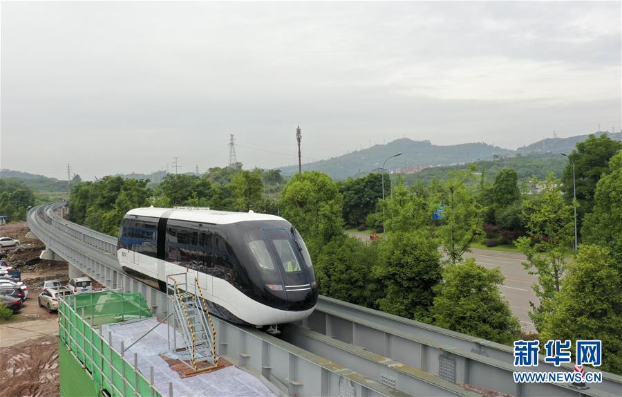 6月3日,一臺(tái)“云巴”在專用運(yùn)行軌道上進(jìn)行調(diào)試(無(wú)人機(jī)照片)。近日,重慶市首條“云巴”示范線項(xiàng)目在重慶璧山區(qū)正式亮相。此次發(fā)布的“云巴”采用電能驅(qū)動(dòng),具有轉(zhuǎn)彎半徑小、爬坡能力強(qiáng)、噪音低、安全性高、建設(shè)成本低、建造周期短等優(yōu)勢(shì),能為乘客提供更智能、舒適、便捷的出行體驗(yàn)。據(jù)介紹,璧山區(qū)“云巴”示范線項(xiàng)目自2019年8月開(kāi)建,線路正線全長(zhǎng)15.4km,共設(shè)車站15座,預(yù)計(jì)2020年9月全線通車。新華社記者劉潺攝。