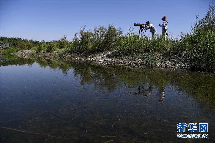 6月3日,李學(xué)明(左)和同事在黃河濕地監(jiān)測、拍攝鳥類活動(dòng)。新華社記者馮開華攝。