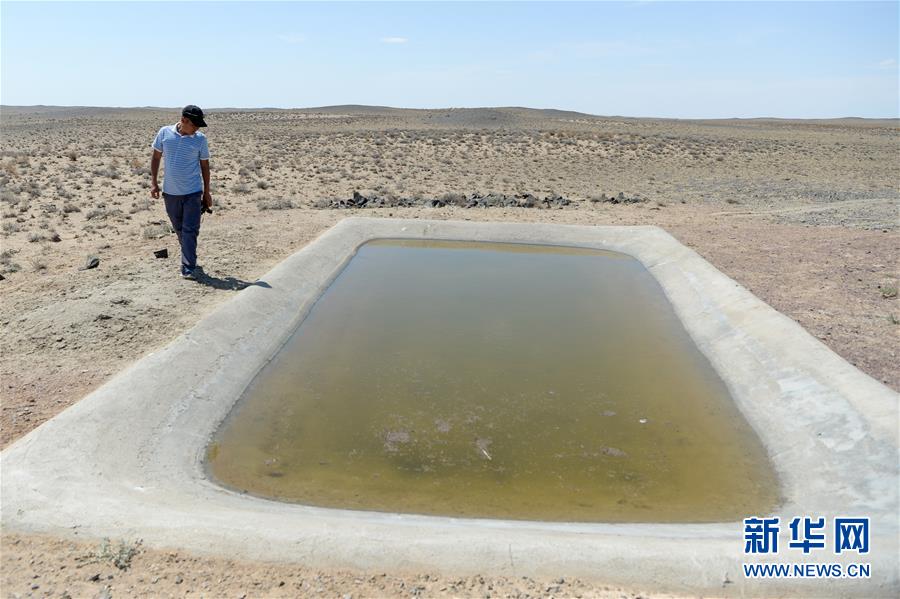 在新疆卡拉麥里山有蹄類野生動物自然保護區(qū),管護員阿達比亞特來到人工建設的水池查看蓄水情況(6月3日攝)。新華社記者丁磊攝。