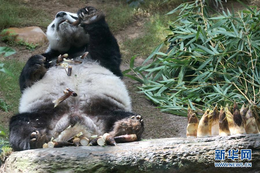在香港海洋公園,大熊貓“安安”在躺著吃美食(5月11日攝)。新華社記者吳曉初攝