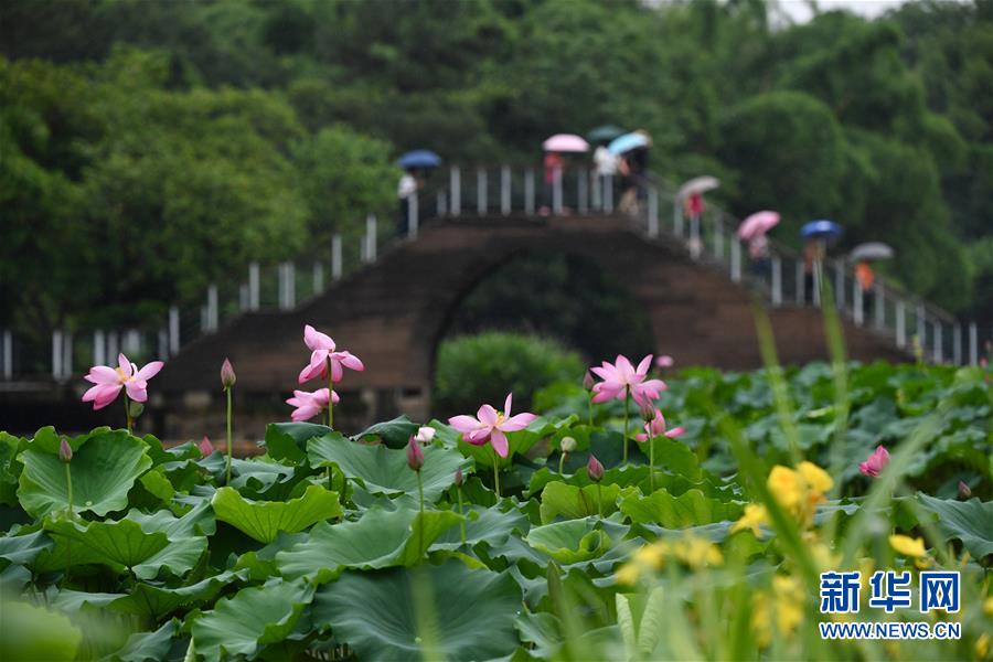 6月7日,一陣小雨過后,福州金山公園內盛開的荷花愈加嬌艷欲滴,吸引市民前來游覽。新華社記者姜克紅攝