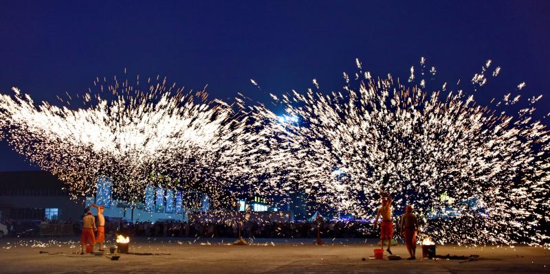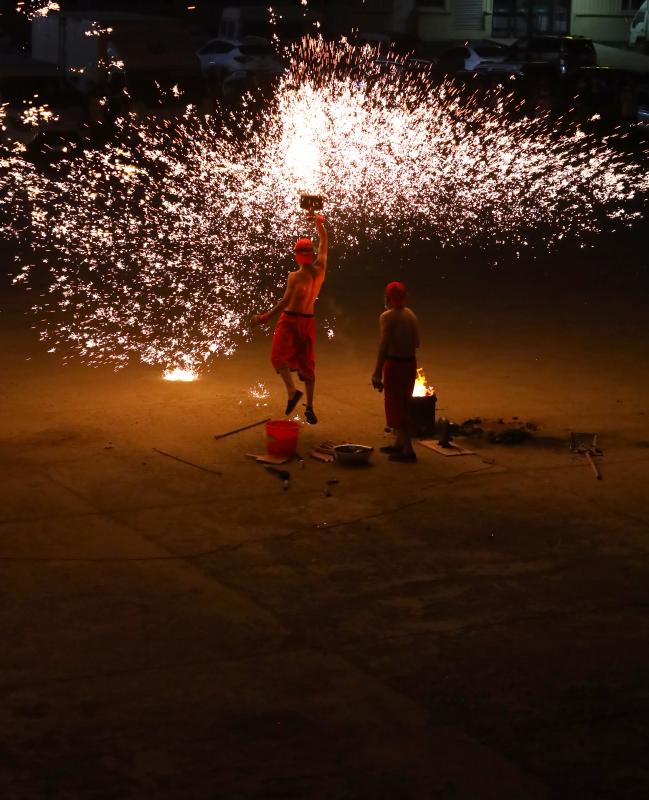 2020年6月7日晚8時許,吉林長春青岡立交橋附近,神韻打鐵花表演隊改進了傳統(tǒng)單一的擊打鐵花的形式,增添了空中轉(zhuǎn)花、高空散花、鋪地印花等多種花型。一柱鐵花沖天,在空中盤旋,朵朵銀花綻放給觀眾帶來了震撼的視覺享受。