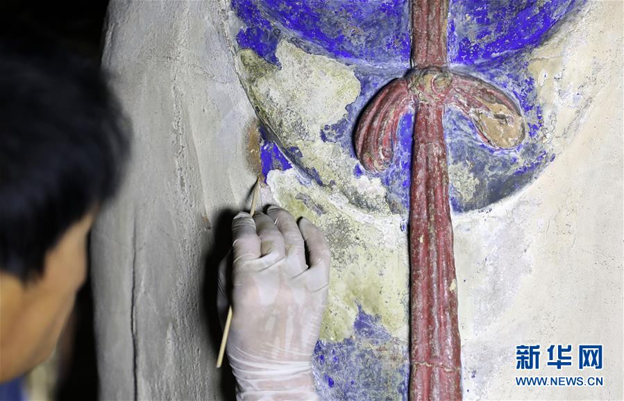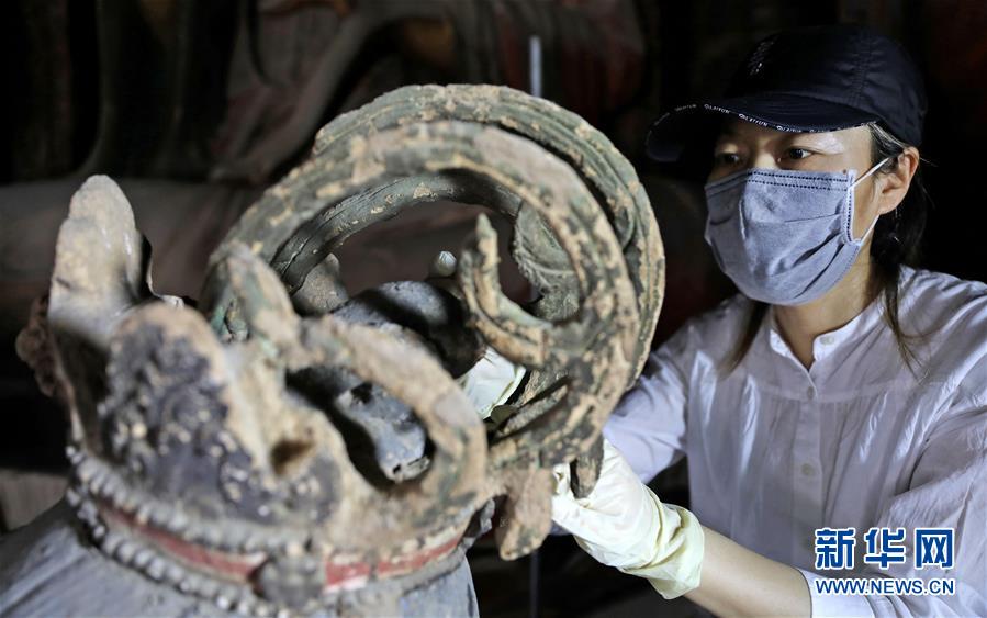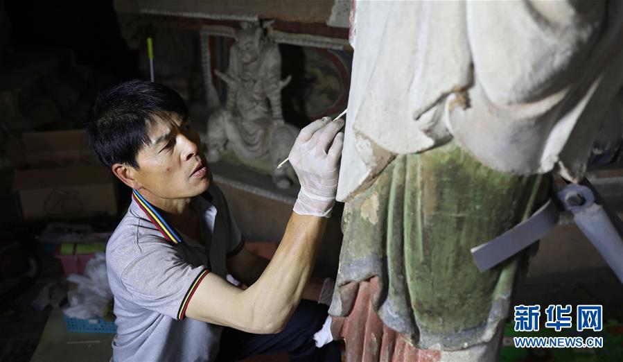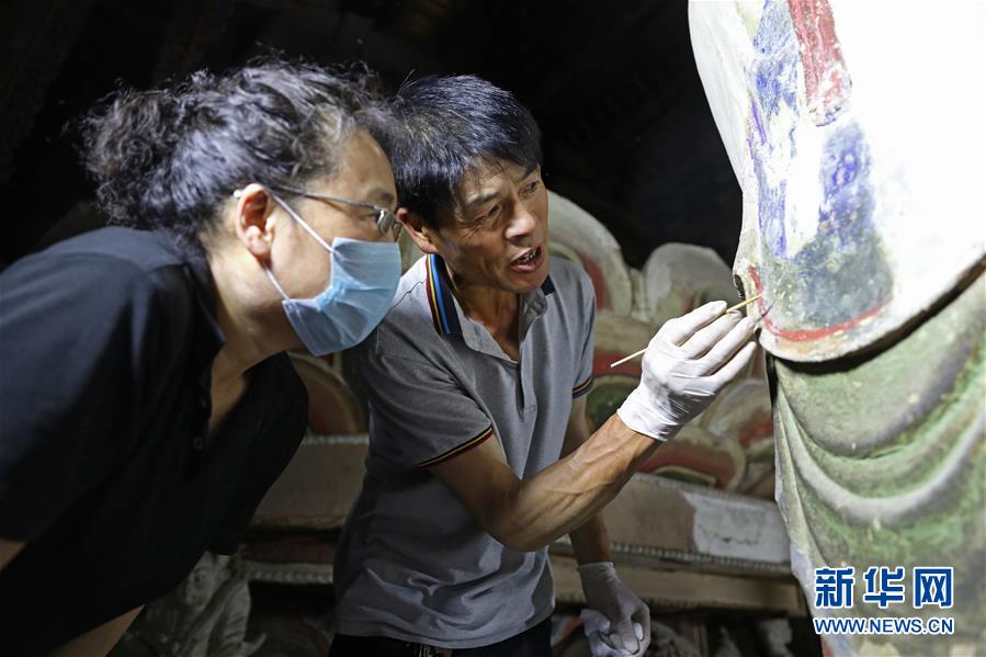6月8日,工作人員對奉國寺的彩繪泥塑進行保護修復。新華社記者姚劍鋒攝
