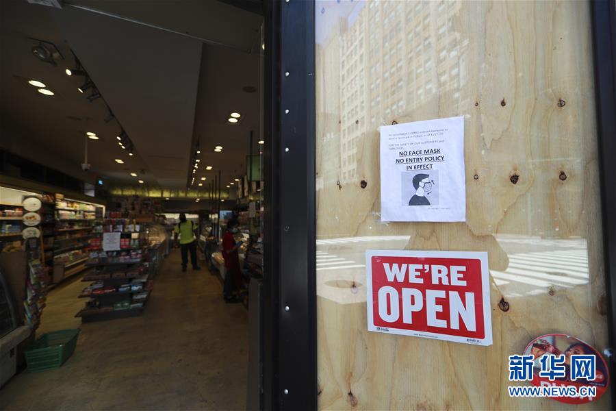 6月8日,美國紐約一家商店的門口貼著佩戴口罩方可進入的提示。在因新冠疫情進入“居家令”近三個月之后,美國紐約市于當?shù)貢r間8日開始“解封”,進入經(jīng)濟重啟的第一階段。新華社記者王迎攝