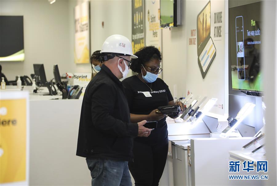6月8日,店員(右)在美國紐約一家電信運營商營業(yè)廳內(nèi)為顧客服務。在因新冠疫情進入“居家令”近三個月之后,美國紐約市于當?shù)貢r間8日開始“解封”,進入經(jīng)濟重啟的第一階段。新華社記者王迎攝