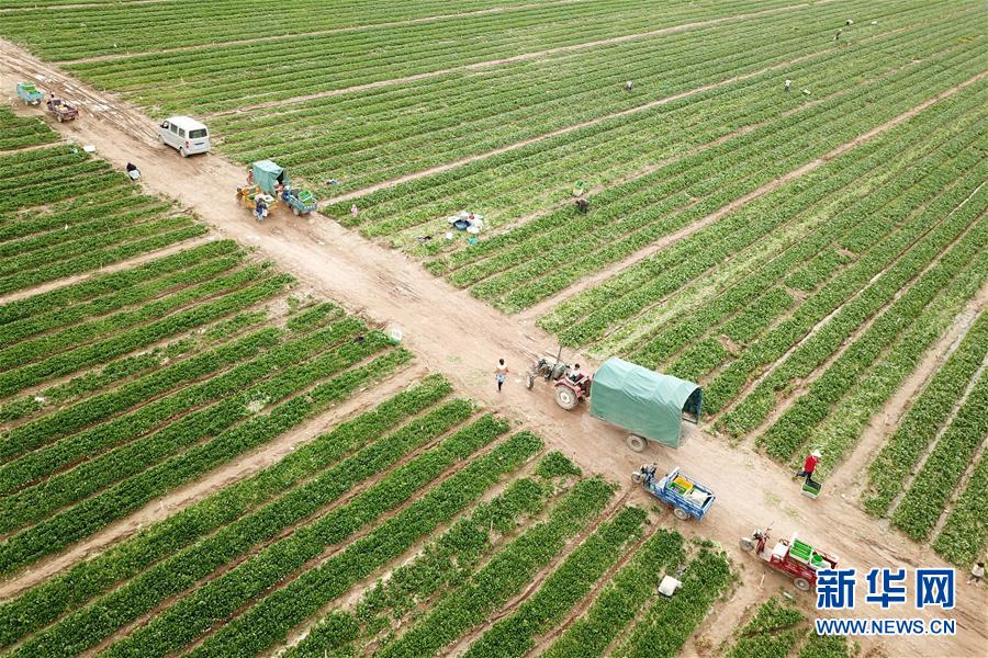 6月8日,粵港澳大灣區(qū)“菜籃子”(金昌)生產(chǎn)基地工作人員在采摘蔬菜(無(wú)人機(jī)照片)。盛夏漸近,位于甘肅省金昌市金川區(qū)的粵港澳大灣區(qū)“菜籃子”(金昌)生產(chǎn)基地的多種蔬菜陸續(xù)豐收。該基地種植面積達(dá)1.3萬(wàn)多畝,采用高效噴灌、精量播種等技術(shù),以及“企業(yè)+合作社+基地+農(nóng)戶(hù)”的模式,通過(guò)輪作倒茬、循環(huán)供應(yīng)的方式,每年可種植蔬菜3至4茬,畝均產(chǎn)量2000公斤左右,總產(chǎn)值達(dá)1.5億元。新華社記者范培珅攝