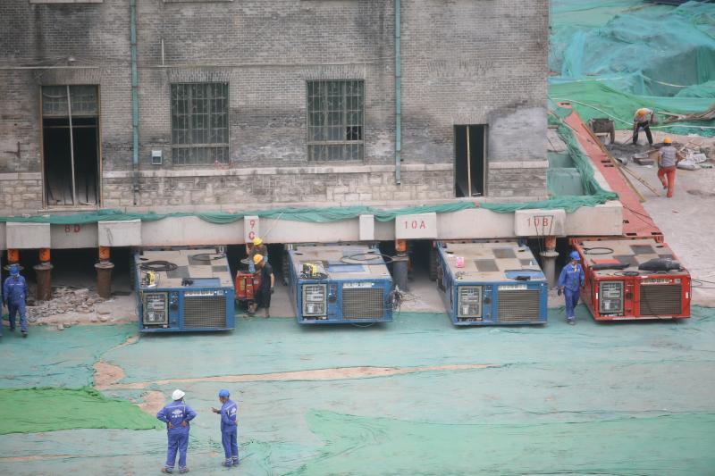 2020年6月9日,濟南在歷山路與東關大街交叉口,液壓模塊拖車在修女樓底部做好平移準備。
