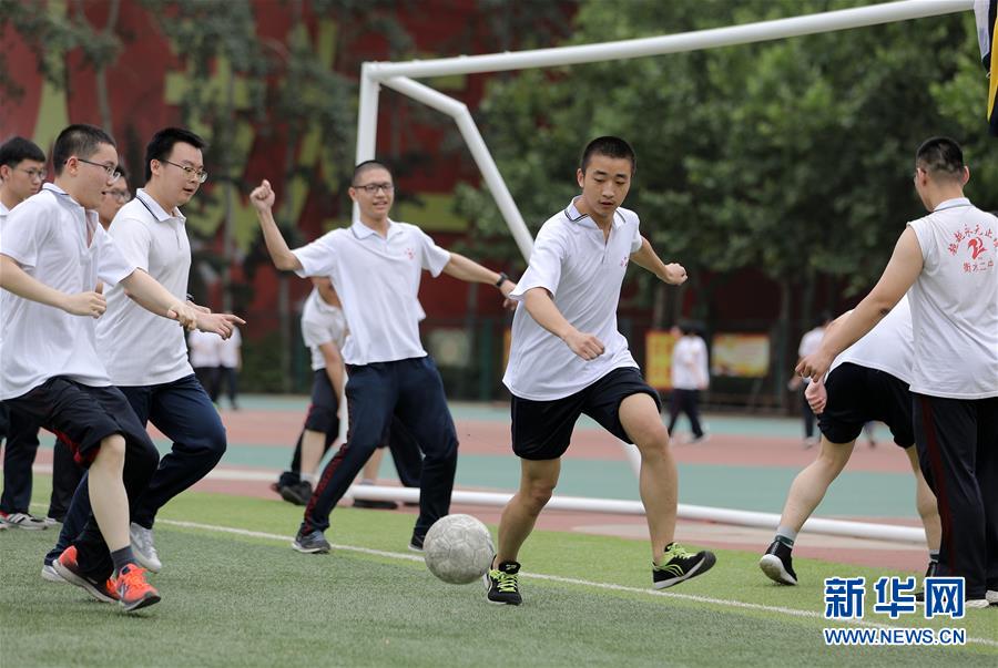 6月9日,河北省衡水市第二中學(xué)的高三學(xué)生在操場上踢足球。2020年高考臨近,河北省衡水市第二中學(xué)組織開展多種形式的集體“減壓”活動,幫助高三學(xué)生在緊張備考之余釋放身心壓力,以輕松、樂觀、自信的心態(tài)迎接高考。新華社記者朱旭東攝