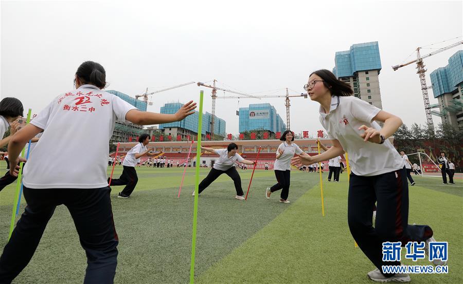 6月9日,河北省衡水市第二中學(xué)的高三學(xué)生在操場上參加減壓趣味游戲。2020年高考臨近,河北省衡水市第二中學(xué)組織開展多種形式的集體“減壓”活動,幫助高三學(xué)生在緊張備考之余釋放身心壓力,以輕松、樂觀、自信的心態(tài)迎接高考。新華社記者朱旭東攝