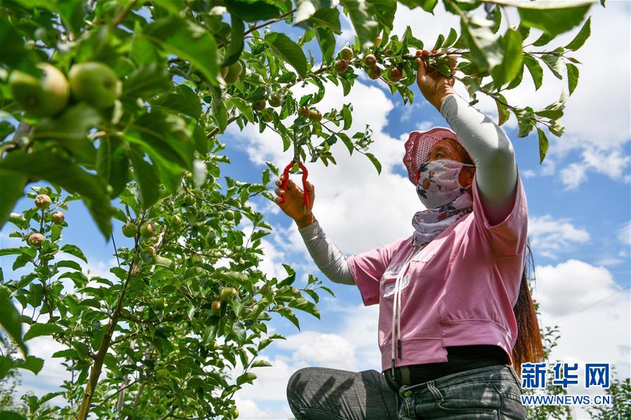 6月11日,農(nóng)民在貴州省威寧縣一處蘋果基地里疏果。近日,貴州省威寧彝族回族苗族自治縣的農(nóng)民搶抓農(nóng)時,對蘋果園進行疏果、除草等田間管理,呈現(xiàn)出一派夏管農(nóng)忙景象。威寧縣蘋果種植面積50余萬畝,蘋果產(chǎn)業(yè)已逐步成為當?shù)剞r(nóng)民增收致富的主導產(chǎn)業(yè)之一。新華社記者楊文斌攝。