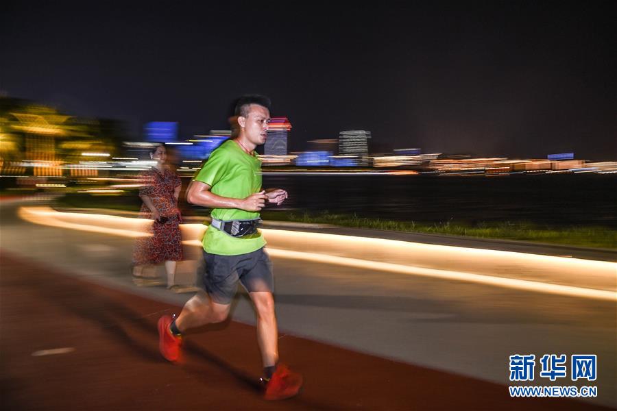 一位市民在海口世紀(jì)公園濱海步道夜跑(5月15日拍攝)。近年來,夜跑成為越來越多都市人熱衷的健身方式之一。在海南海口,每當(dāng)夜幕降臨,“夜跑族”來到??谌f綠園、世紀(jì)公園等夜跑場所跑步,用一身酣暢淋漓的汗水?dāng)[脫白天工作中的壓力,享受跑步帶來的歡愉。新華社記者 蒲曉旭 攝