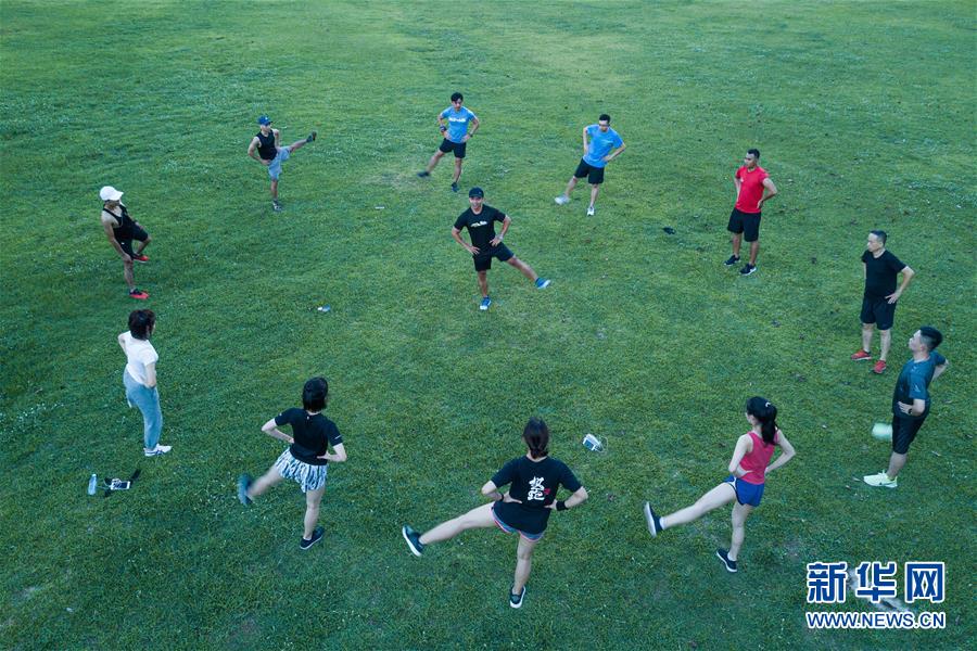 6月11日傍晚,在??谌f綠園,市民在夜跑前做熱身運動(無人機拍攝)。近年來,夜跑成為越來越多都市人熱衷的健身方式之一。在海南???,每當(dāng)夜幕降臨,“夜跑族”來到海口萬綠園、世紀(jì)公園等夜跑場所跑步,用一身酣暢淋漓的汗水?dāng)[脫白天工作中的壓力,享受跑步帶來的歡愉。新華社記者 蒲曉旭 攝