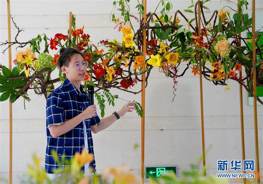 6月13日,第45屆世界技能大賽花藝項目冠軍、上海應用技術大學學生陸亦煒在介紹自己主持設計和創(chuàng)作的花藝作品。當日,“2020中國(上海)萱草文化節(jié)”在上海應用技術大學開幕,校園里數百個品種的萱草花競相綻放,萱草科研推廣、萱草文化交流等多項活動同時舉行。新華社記者 劉穎 攝