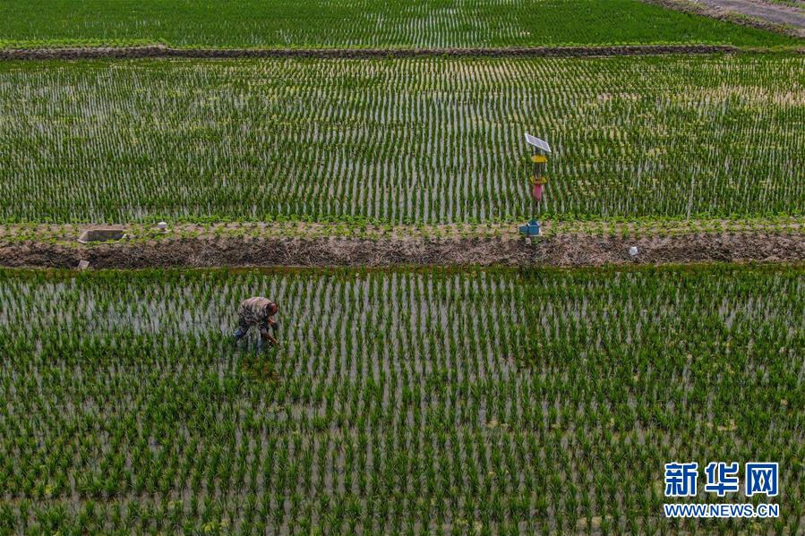 6月17日,農(nóng)民在盤錦市盤山縣太平街道張家村稻田間進(jìn)行管護(hù)作業(yè)(無人機(jī)照片)。新華社記者 潘昱龍 攝