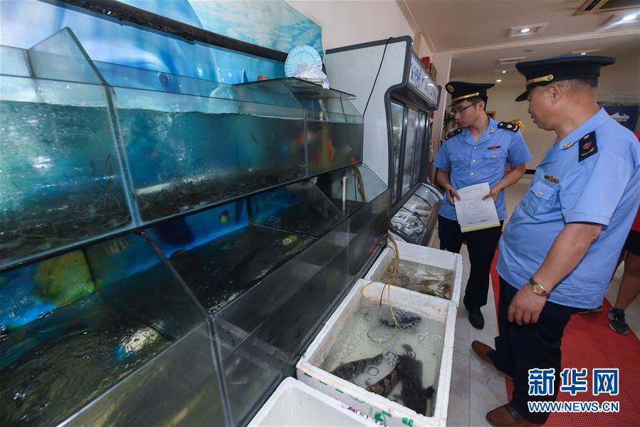 6月17日,市場(chǎng)監(jiān)管執(zhí)法人員在東林鎮(zhèn)農(nóng)貿(mào)市場(chǎng)開(kāi)展專(zhuān)項(xiàng)執(zhí)法行動(dòng),檢查是否存在非法銷(xiāo)售野生動(dòng)物的情況。新華社記者 徐昱 攝
