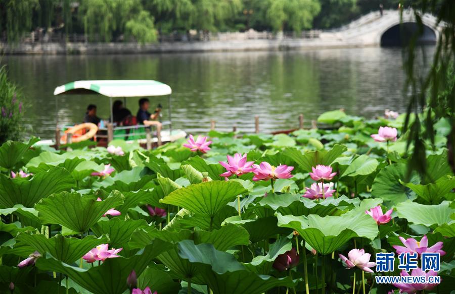 6月19日,市民泛舟在大明湖上。近日,山東濟(jì)南大明湖的荷花陸續(xù)綻放,吸引游客前來觀賞。新華社記者 王凱 攝