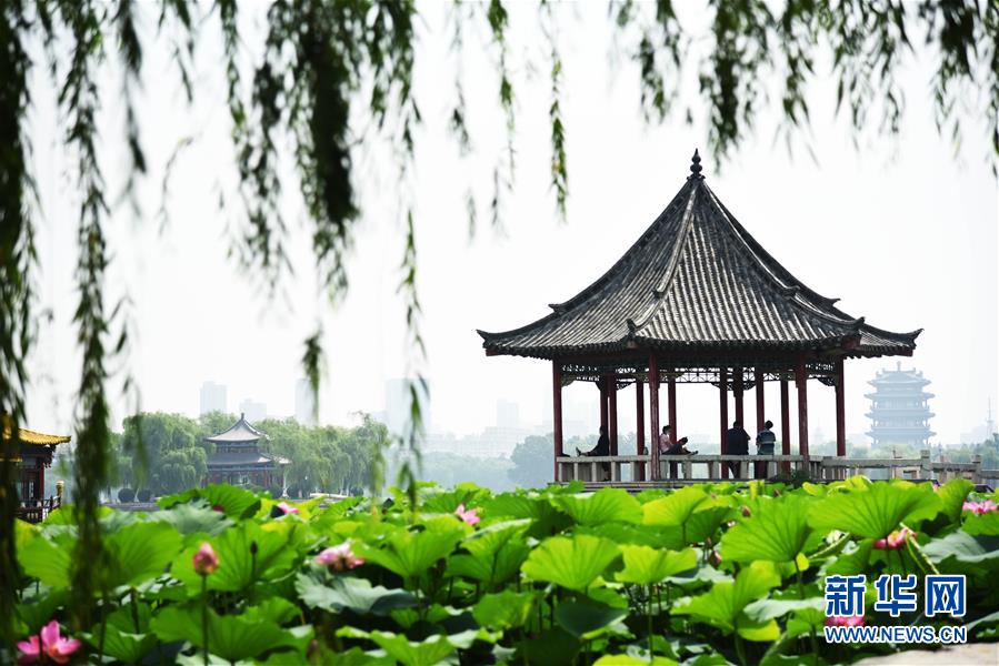 6月19日,市民在大明湖畔欣賞荷花。近日,山東濟(jì)南大明湖的荷花陸續(xù)綻放,吸引游客前來(lái)觀賞。新華社記者 王凱 攝