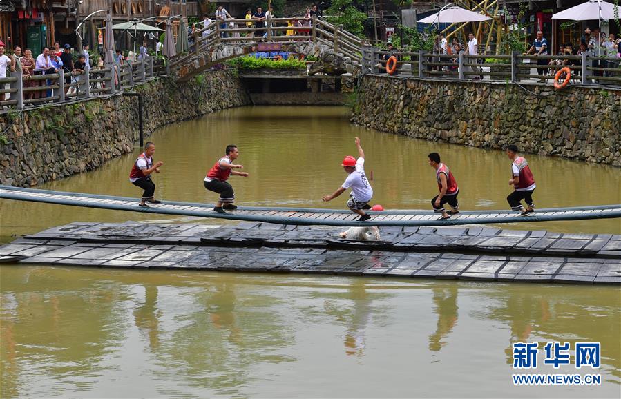 在廣西融水雙龍溝森林旅游度假區(qū)夢嗚苗寨,幾位搬遷戶協(xié)助游客挑戰(zhàn)“搖擺橋”(6月21日攝)。近年來,融水打造原生態(tài)苗族文化體驗園——夢嗚苗寨,讓搬遷進城的貧困戶住進復原建設的老房子。景區(qū)提供綠化保潔、游樂設施管理、民族歌舞表演等工作崗位,多渠道增加貧困戶收入。新華社記者黃孝邦攝