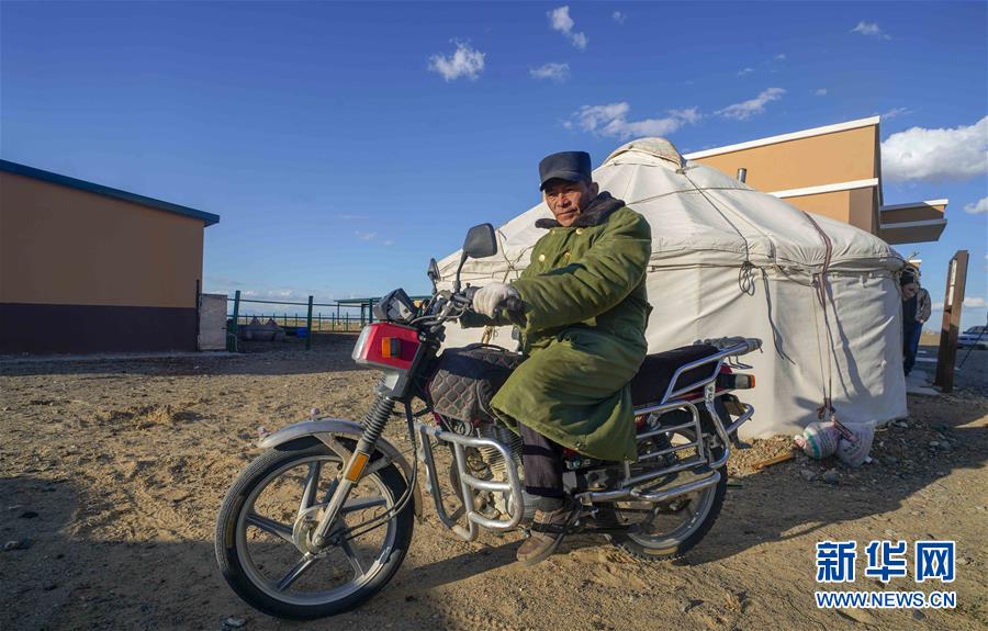 在吉木乃縣萬駝園內(nèi),傍晚時分,牧民米拉木別克·阿依提克準(zhǔn)備騎著摩托車將駱駝趕回圈內(nèi)(6月21日攝)。新華社記者趙戈攝