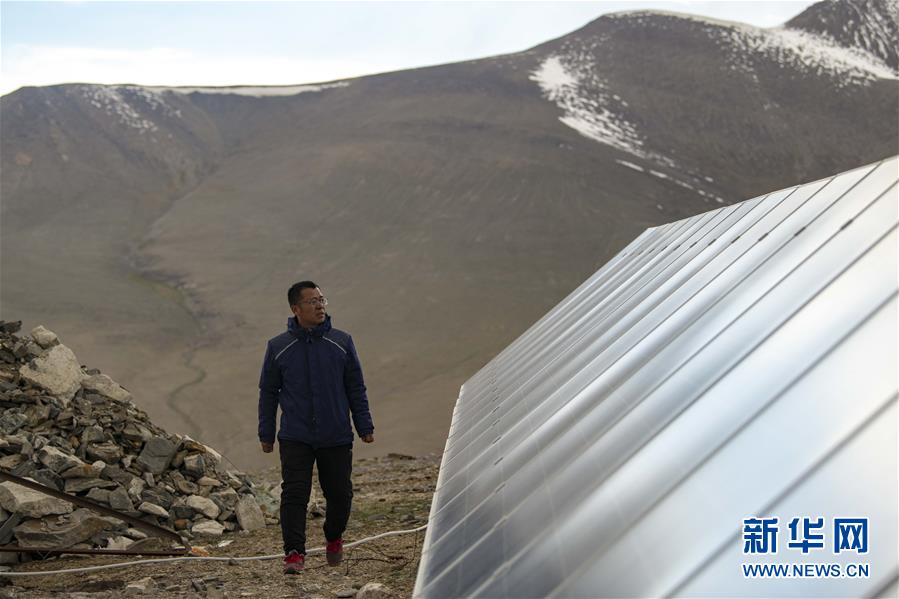 在中國科學(xué)院新疆天文臺慕士塔格觀測站,馮國杰檢查太陽能光伏電板的運(yùn)行情況(6月15日攝)。新華社記者胡虎虎攝