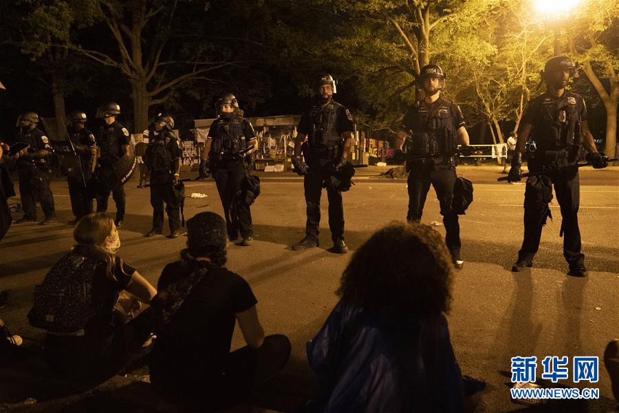 6月22日,警察和示威者在美國華盛頓白宮附近對峙。美國警察和示威者22日晚在首都華盛頓市白宮北側(cè)拉斐特廣場發(fā)生沖突并對峙。美國總統(tǒng)特朗普在社交媒體上說,許多人因破壞廣場上美國前總統(tǒng)安德魯·杰克遜的雕像及附近圣約翰圣公會(huì)教堂被逮捕。新華社記者劉杰攝