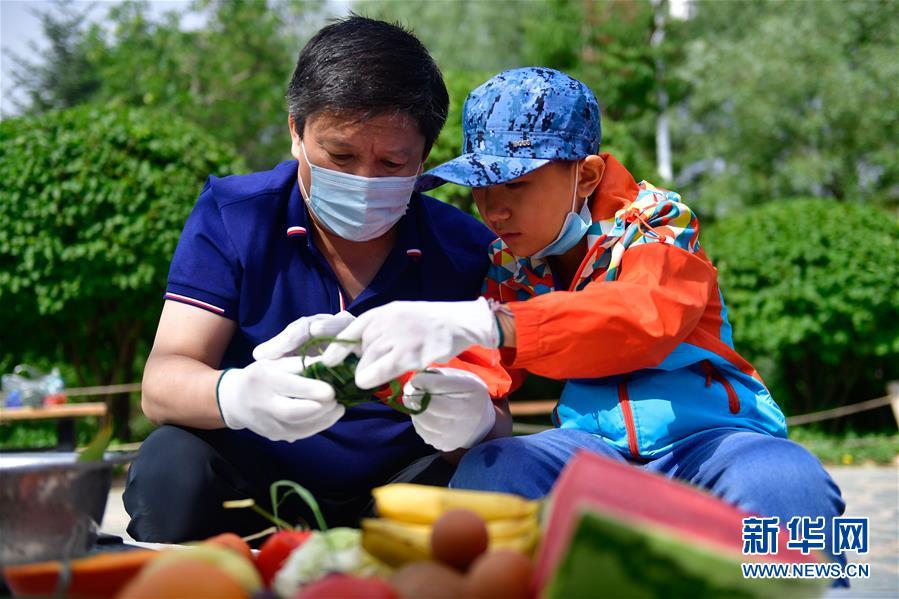 6月25日,在青海省西寧野生動物園,一位小朋友在父親的幫助下包粽子。新華社記者 張龍 攝