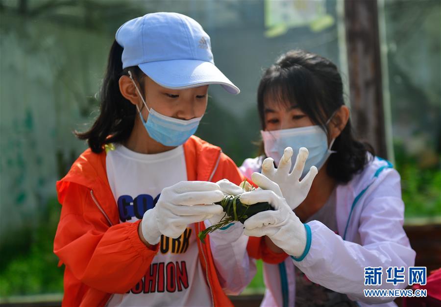 6月25日,在青海省西寧野生動物園,一位小朋友在母親幫助下包粽子。新華社記者 張龍 攝