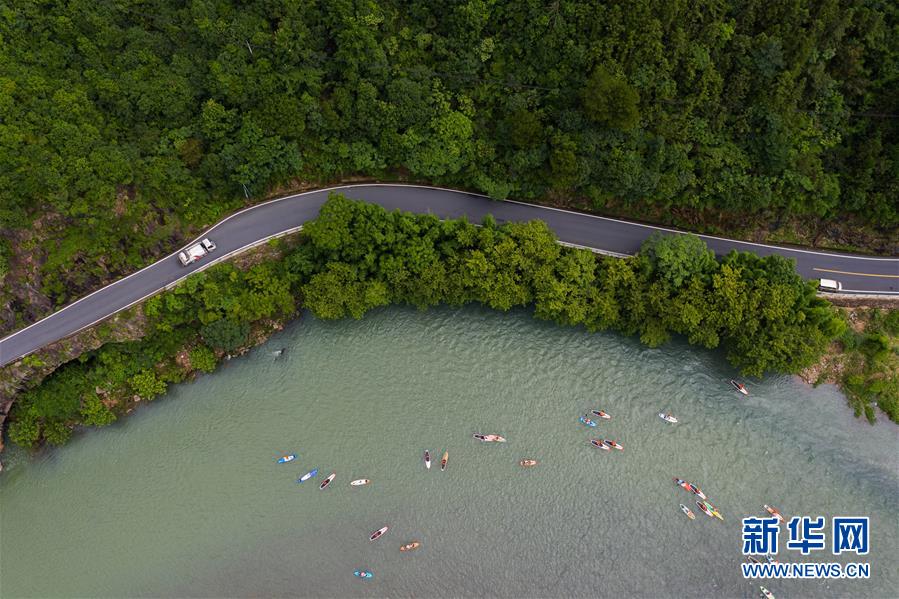 水上運(yùn)動(dòng)愛(ài)好者在杭州市富陽(yáng)區(qū)湖源鄉(xiāng)的壺源溪上體驗(yàn)槳板運(yùn)動(dòng)的樂(lè)趣(6月28日攝,無(wú)人機(jī)照片)。近期,浙江省杭州市富陽(yáng)區(qū)場(chǎng)口鎮(zhèn)、常安鎮(zhèn)和湖源鄉(xiāng)組團(tuán)開(kāi)啟了一場(chǎng)夏季“綠水青山嘉年華”。這幾個(gè)壺源溪流域鄉(xiāng)鎮(zhèn)整合生態(tài)旅游資源,組團(tuán)開(kāi)發(fā)山村旅游項(xiàng)目,游客可以參與壺源溪水上游樂(lè)、露營(yíng)永安山頂、特色農(nóng)產(chǎn)品集市和瓜果節(jié)等特色活動(dòng)。新華社記者徐昱攝