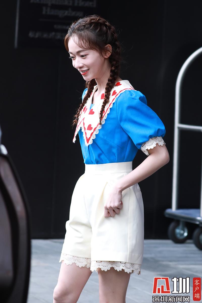 吳謹(jǐn)言身穿藍(lán)色上衣搭配白裙秀美腿,少女感十足。