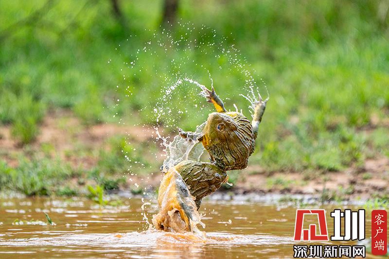2020年6月30日報(bào)道(具體拍攝時間不詳),南非波羅克瓦克,兩只雄性非洲牛蛙為了爭奪雌性牛蛙,在池塘中打架,這樣的情形十分罕見。畫面中,戰(zhàn)況十分激烈,一只非洲牛蛙在另外一只試圖逃到池塘邊緣時撕咬對手,甚至將另外一只拋向空中。這些精彩的照片是由南非開普敦?cái)z影師Temujin Johnson拍攝的。