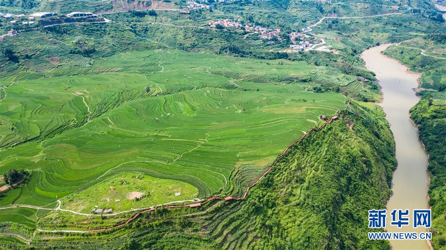 貴州省盤州市新民鎮(zhèn)的梯田風(fēng)光(6月29日攝,無人機(jī)照片)。夏日時節(jié),貴州省盤州市新民鎮(zhèn)的梯田風(fēng)景如畫。新華社記者陶亮攝