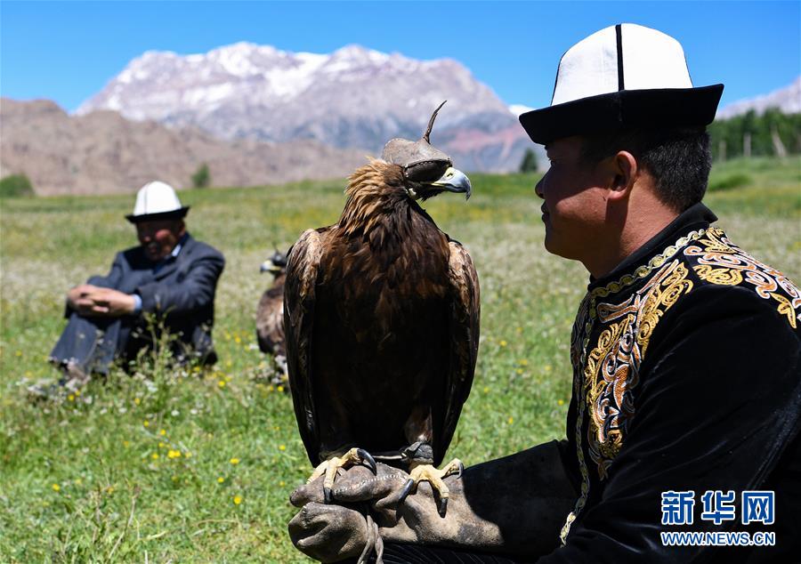 6月29日,庫爾馬西·胡特曼(右)和他的徒弟帶著獵鷹出游。新華社記者宋彥樺攝