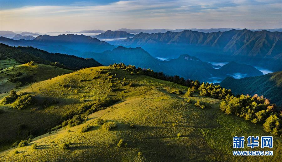 6月30日,朝霞照耀下的神田草甸(無人機照片)。位于陜西省安康市嵐皋縣與重慶市城口縣交界處大巴山神田主脊北坡的神田草甸,面積超過1.1萬畝。夏日的朝霞中,起伏的草甸仿佛一塊寬大無邊的綠色地毯,鑲嵌在大巴山上,如詩如畫。新華社記者陶明攝