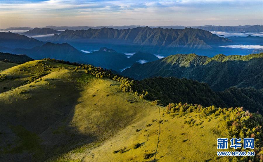 6月30日,朝霞照耀下的神田草甸(無人機照片)。位于陜西省安康市嵐皋縣與重慶市城口縣交界處大巴山神田主脊北坡的神田草甸,面積超過1.1萬畝。夏日的朝霞中,起伏的草甸仿佛一塊寬大無邊的綠色地毯,鑲嵌在大巴山上,如詩如畫。新華社記者陶明攝
