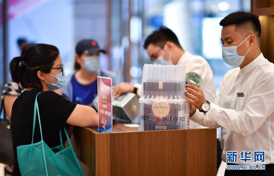 7月1日,海口日月廣場免稅店的工作人員為顧客打包酒類商品。當日,海南開始實施調整后的離島免稅購物政策。海南離島旅客每年每人免稅購物額度提高至10萬元,電子消費產品等7類新增商品開售。新華社記者郭程攝