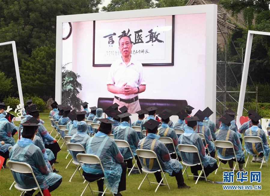 7月2日,2020屆畢業(yè)生在畢業(yè)典禮上觀看校友代表、國(guó)家呼吸系統(tǒng)疾病臨床醫(yī)學(xué)研究中心主任鐘南山發(fā)言視頻。當(dāng)日,北京大學(xué)舉行2020年畢業(yè)典禮。由于疫情防控需要,今年的典禮在北京大學(xué)辦公樓西側(cè)廣場(chǎng)、靜園草坪、未名湖等九個(gè)會(huì)場(chǎng)舉行,并面向全球進(jìn)行中英文雙語(yǔ)直播,僅部分在校畢業(yè)生現(xiàn)場(chǎng)參加,更多畢業(yè)生通過(guò)線上直播參與畢業(yè)典禮。新華社記者任超攝