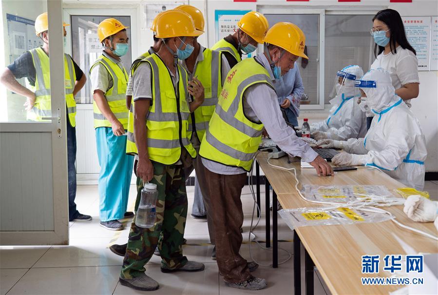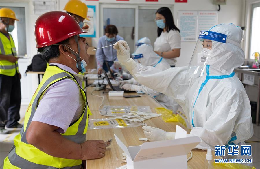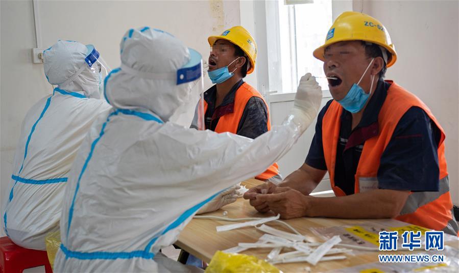 7月2日,在北京市大興區(qū)中建三局二公司北京公司一項目建筑工地的臨時核酸檢測采樣點,醫(yī)護(hù)人員為建筑工地人員采集咽拭子。新華社記者才揚(yáng)攝