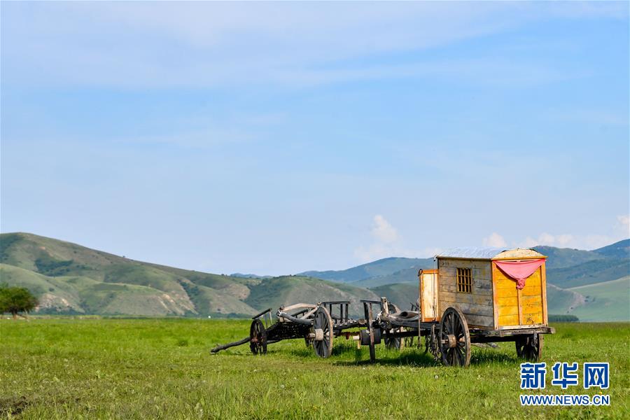 烏蘭毛都草原上的勒勒車(chē)(7月1日攝)。盛夏時(shí)節(jié),內(nèi)蒙古興安盟科爾沁右翼前旗的烏蘭毛都草原綠意盎然,風(fēng)景醉人。烏蘭毛都草原地處大興安嶺南麓,屬丘陵山地草原,風(fēng)光獨(dú)特。新華社記者貝赫攝