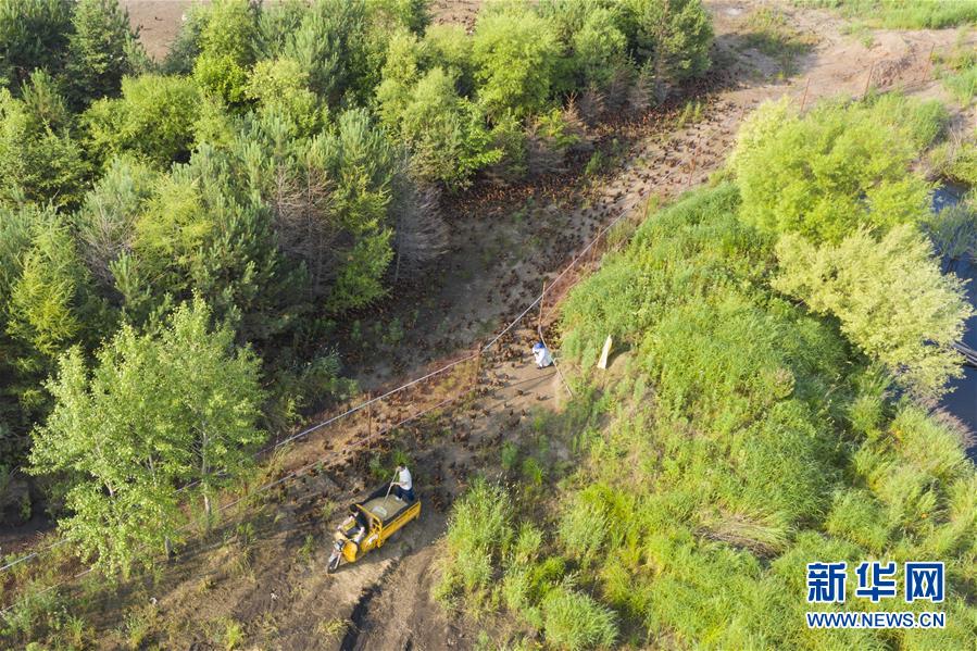 7月2日,在黑龍江省五大連池市的草原上,桑慶軍在喂雞(無人機照片)。新華社記者謝劍飛攝