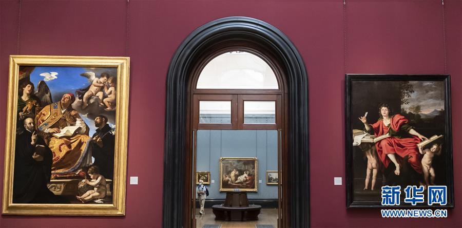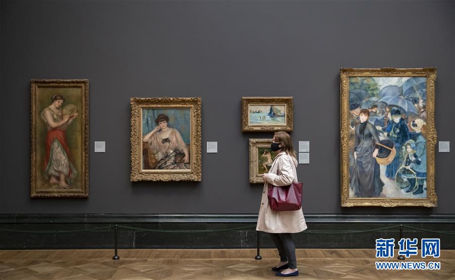 7月4日,參觀者佩戴口罩在英國國家美術(shù)館的媒體開放日上參觀。受新冠疫情影響而關(guān)閉的英國國家美術(shù)館將于7月8日重新對公眾開放,成為倫敦首批開門迎客的博物館、美術(shù)館。參觀者需提前網(wǎng)上預約參觀時段,全程佩戴口罩且保持安全距離。新華社記者韓巖攝