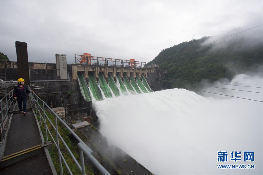 7月8日,新安江水庫開啟9孔泄洪,新安江電廠工作人員在壩區(qū)巡視。新華社記者翁忻旸攝