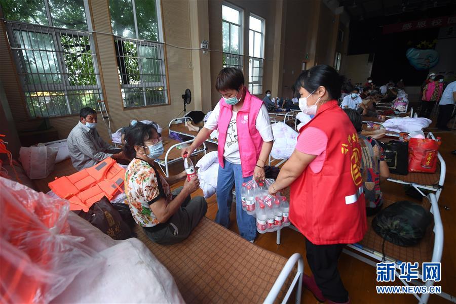7月8日,在杭州市富陽區(qū)東洲街道安置點(diǎn)東洲中心小學(xué),志愿者向村民發(fā)礦泉水等物資。新華社記者徐昱攝