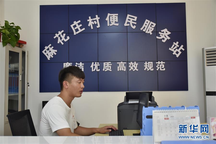 7月8日,張亞博在麻花莊村便民服務(wù)站整理資料。新華社記者韓朝陽攝