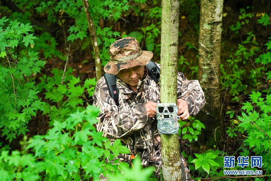 董紅雨在迎春林業(yè)局有限公司施業(yè)區(qū)內(nèi)查看架設(shè)在樹上用于拍攝野生東北虎蹤跡的遠紅外相機(7月8日攝)。新華社記者王松攝