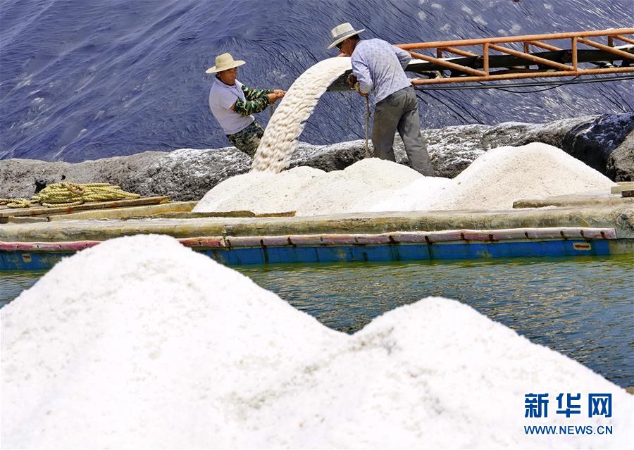 7月9日,唐山市曹妃甸區(qū)南堡鹽場(chǎng)的工人將收獲的春鹽裝船。在我國(guó)長(zhǎng)蘆鹽區(qū)海鹽生產(chǎn)基地之一的河北省唐山市曹妃甸區(qū)南堡鹽場(chǎng),一年一度的春鹽收獲工作即將結(jié)束,今年南堡鹽場(chǎng)的春鹽產(chǎn)量預(yù)計(jì)可達(dá)72萬(wàn)噸。新華社記者楊世堯攝